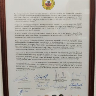 Złożony dzisiaj podpis na deklaracji przystąpienia do Obywatelskiego Komitetu Ochrony Powstańców "OKOP" oznacza, że żyjący wśród nas Bohaterzy Powstania Warszawskiego i zarazem podopieczni Domu Wsparcia Powstańców Warszawskich otrzymają bezpłatną ochronę swoich domostw.